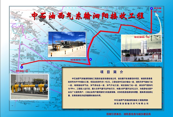 泗陽天然氣項(xiàng)目三期工程即中石油西氣東輸泗陽接收工程,是經(jīng)省發(fā)改委批準(zhǔn)立項(xiàng)、省住建廳批準(zhǔn)建設(shè)的項(xiàng)目,是泗陽縣委、縣政府2010年重點(diǎn)民生工程,項(xiàng)目總投資約為1.2億元。工程包括泗陽天然氣接收門站一座,城南高中壓調(diào)壓站、壓縮母站和加氣站各一座,城區(qū)高中壓調(diào)壓站加氣站各一座,高壓供氣管道15公里。工程于2010年8月15日開工,12月28日全面竣工,2011年1月28日試運(yùn)行,2月28日正式分輸供氣。2011年3月19日,泗陽縣委、縣政府在榮浩集團(tuán)辦公大樓前舉行了隆重的投產(chǎn)通氣儀式,宿遷市副市長趙深、泗陽縣委書記李榮錦等四套班子領(lǐng)導(dǎo)出席了儀式;中石油西氣東輸銷售公司總經(jīng)理助理李世泉同志也出席了投產(chǎn)儀式,并發(fā)表了熱情洋溢的講話。該工程投入運(yùn)行后,最大日供氣量可達(dá)200余萬立方米,年最大供氣量可達(dá)6億立方米,為泗陽及周邊縣市眾多工商企業(yè)用戶提供強(qiáng)有力的能源保障,對(duì)加快蘇北能源結(jié)構(gòu)調(diào)整、提高清潔能源比重、發(fā)展低碳經(jīng)濟(jì)、促進(jìn)節(jié)能減排都將起到重要的推動(dòng)作用。